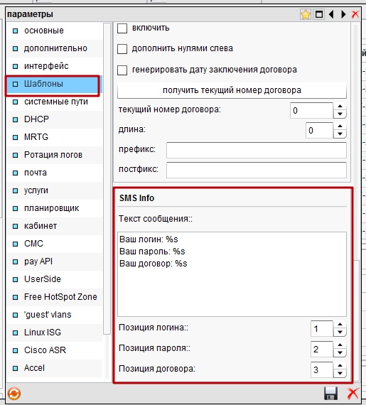 Переходим в меню Настройки/Системные опции/Параметры/Шаблоны/SMS Info