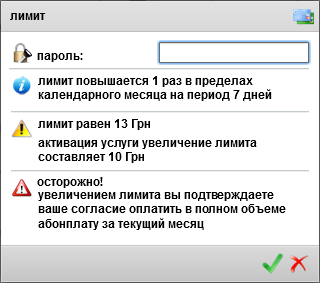 Обычный лимит. Активируется опцией под номером (20) «Разрешить кредит» во вкладке «Услуги» в свойствах тарифа. Цена активации кредита задается в поле ввода (21) «Цена активации кредита». Опция (26) «Возврат суммы активации» определяет - будет ли возвращена стоимость активации кредита, если счет был пополнен в течении 24 часов после получения кредита. Активация опции (27) «Фиксированный кредит» задаст сумму лимита равной значению указанному в поле слева от нее, вместо автоматической, которая равна величине месячной абонплаты + цена реальника + 1. Для каждого тарифа настройки индивидуальны. Период действия лимита задается в «Системных опциях» во вкладке «Услуги» → «Дата начала выдачи кредитов» и «Дата закрытия всех кредитов».