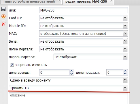 Показать исходный текстСсылки сюдаНаверх Содержание Настройка связки MikBiLL - Trinity Настройка услуги Настройка тарифа Добавление Приставки. Активация услуги у абонента Trinity[проверка] Настройка связки MikBiLL - Trinity Перейти Настройки - системные опции - параметры - IPTV - trinity Указываем параметры partnerID и salt Нажимаем кнопку сохранить Готово настройка связки закончена. Настройка услуги Переходим: Настройки ⇒ Справочники ⇒ услуги Указываем Внешний ID который вам выдал Trinity для данного пакета услуг Указываем middleware - Trinity Настройка тарифа Переходим в карточку тарифа Меню подписка указываем необходимые услуги Сохранить Добавление Приставки. Перейти Настройки - Справочники - услуги в фильтре выбрать типы устройств пользователей Указываем middleware - Trinity Активация услуги у абонента Добавляем устройство в карточке абонента в разделе «Устройство пользователя» нажав на клавишу «добавить» Добавляем услугу абонента (если она индивидуальная) По окончанию всех перечисленных действий у абонента будет активная подписка: config/iptv/trinity.txt Последние изменения: 2019/12/16 18:22 — gudwin