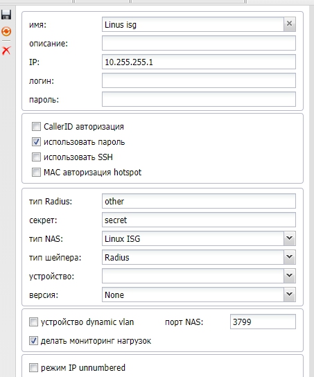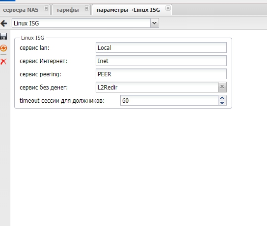 Показать исходный текстСсылки сюдаНаверх Содержание tc.conf config.pl Вывод iptables Настройка Linux ISG в связке с MikBiLL Для начала установите Linux ISG Описание Начиная с версии 2.0.6 MikBiLl полностью поддерживает данный тип NAS. Сама система Linux ISG представляет из себя весьма хороший софт для обеспечения достпа типа IPoE/IPNet Так же демонстрирует Весьма высокий HiLoad Пример: core i7 2x dual 1G intel cards ( 2 гигабита трафика) NAT шейпер 4к онлайн абонентов все это на одной машине Linux ISG в работе с MikBiLL необходимо настроить только как указано ниже и никак иначе. Вы настраиваете все 4 указанных сервиса. Интернет будет шейпаться. Так же отключатся или включатся по необходимости Абонентам в случае отключения интернета будет показывать «страницу без денег» используется сервис типа Tagger(Linux ISG), без него настроить не удастся. Так же абонент даже в случае отключенного интернета будет показываться в онлайн, это особенности работы данной системы. Настройка NAS Системные опции В системных опциях указываем имена сервисов (рекомендуем как в примере) Пример действующего конфига tc.conf содержимое cat /opt/ISG/etc/tc.conf ## Traffic classes EXAMPLE for lISG ## Format: Class name IPv4 prefix (subnet) #RFC1918 10.0.0.0/8 #RFC1918 192.168.0.0/16 #RFC1918 172.16.0.0/12 LOCAL 192.168.0.0/16 PEER 10.0.2.0/30 #L4REDIR 172.22.0.0/24 # All other traffic EXCEPT for RFC1918, OUR_LOCAL, PEERING and SPECIFIC classes # falls here. PLEASE NOTE THIS! All OTHER traffic, NOT JUST ALL traffic! INET 0.0.0.0/0 config.pl содержимое cat /opt/ISG/etc/config.pl #!/usr/bin/perl -w ### Detach from console after successful start $cfg{daemonize} = 1; ### Log to syslog using this facility $cfg{log_facility} = "local7"; ### RADIUS-related settings ### You can specify as many as you want RADIUS servers. If server with lower index ### is not answering, server with next index will be tried (0, 1, 2, etc...). $cfg{radius_auth}{0} = { server => "192.168.0.1:1812", timeout => 100, secret => "secret" }; $cfg{radius_acct}{0} = { server => "192.168.0.1:1813", timeout => 100, secret => "secret" }; $cfg{nas_identifier} = "LinuxISG"; ## By default equals to NAS IP-address ### CoA-related settings $cfg{coa_server} = "192.168.0.1"; ## Accept requests only from this IP (comment to accept from all) $cfg{coa_secret} = "secret"; ## Shared secret $cfg{coa_port} = 3799; ## Local UDP port to listen for CoA requests ### Send Interim-Update to RADIUS server every session_alive_interval seconds $cfg{session_alive_interval} = 300; ## Every minute (0 = don't send) ### Session inactivity default timeout (disconnect session after this time) (in seconds) $cfg{session_idle_timeout} = 1800; ### Session default maximum duration (end session after this time) (in seconds) $cfg{session_max_duration} = 86400; ### Unauth session maximum duration (end session after this time) (in seconds) $cfg{unauth_session_max_duration} = 60; ### This services will be automatically applied if session was rejected by RADIUS #$cfg{unauth_service_name_list} = [ "ATESTSERV", "AREDIRECT" ]; ### Check traffic classification file MD5 sum every N seconds. If sum was changed re-read this file. $cfg{tc_check_interval} = 300; ## Every 5 minutes ####################### Services description ####################### $cfg{srv}{"INET"}{type} = "policer"; $cfg{srv}{"INET"}{traffic_classes} = [ "INET" ]; $cfg{srv}{"LOCAL"}{traffic_classes} = [ "LOCAL" ]; $cfg{srv}{"PEER"}{traffic_classes} = [ "PEER" ]; $cfg{srv}{"L4REDIR"}{type} = "tagger"; $cfg{srv}{"L4REDIR"}{traffic_classes} = [ "INET" ]; #################### End services description ###################### ### ### It's better not to touch anything below this line ### $cfg{debug} = 1; $cfg{pid_file} = "/var/run/ISGd.pid"; $cfg{radius_dictionary} = $FindBin::RealBin . "/../etc/raddb/dictionary"; $cfg{tc_file} = $FindBin::RealBin . "/../etc/tc.conf" Вывод iptables root@ISG:/opt/ISG/bin# iptables -L -n Chain INPUT (policy ACCEPT) target prot opt source destination Chain FORWARD (policy ACCEPT) target prot opt source destination ISG all -- 192.168.55.0/24 0.0.0.0/0 ISG initiator src mode ISG all -- 0.0.0.0/0 192.168.55.0/24 ISG Chain OUTPUT (policy ACCEPT) target prot opt source destination root@ISG:/opt/ISG/bin# iptables -L -n -t nat Chain PREROUTING (policy ACCEPT) target prot opt source destination DNAT tcp -- 0.0.0.0/0 0.0.0.0/0 tcp dpt:80ISG match service L4REDIR to:192.168.0.1 Chain INPUT (policy ACCEPT) target prot opt source destination Chain OUTPUT (policy ACCEPT) target prot opt source destination Chain POSTROUTING (policy ACCEPT) target prot opt source destination config/nas_servers/linux_isg.txt Последние изменения: 2019/12/18 22:44 — gudwin