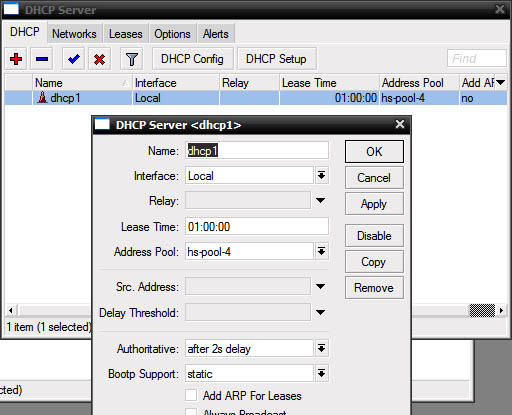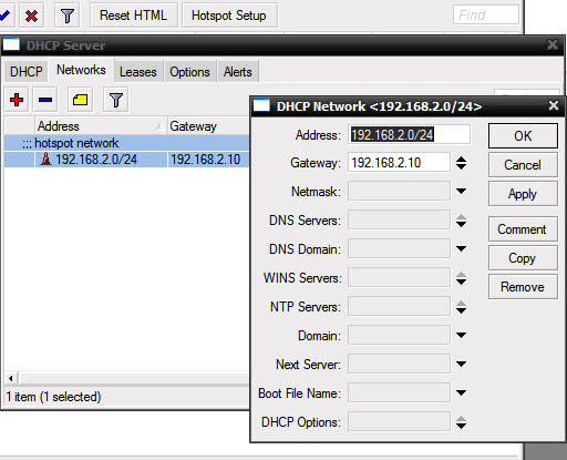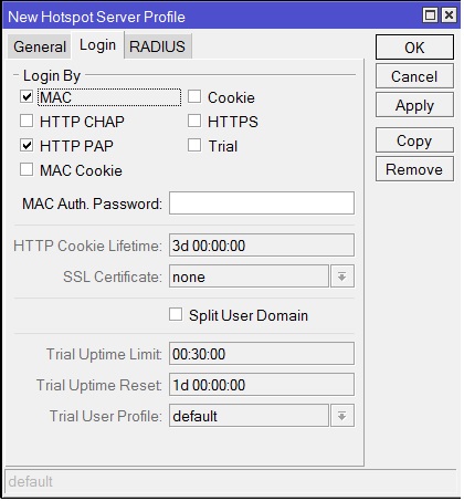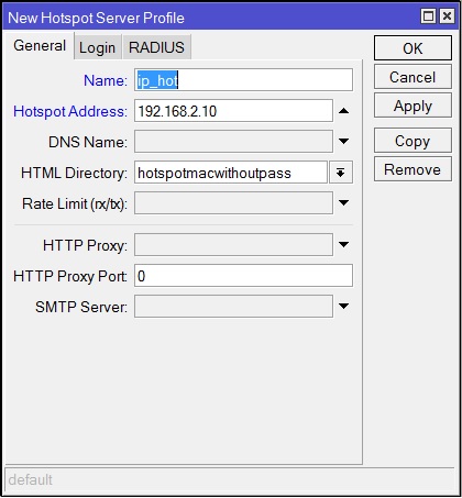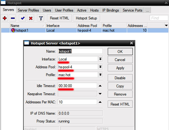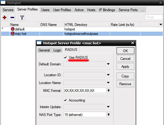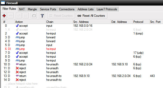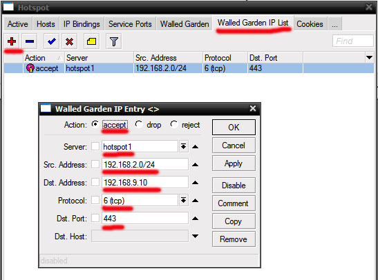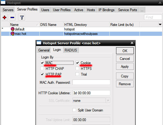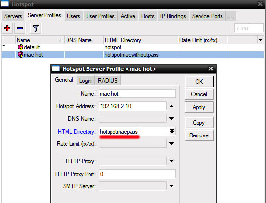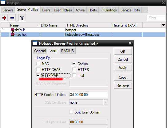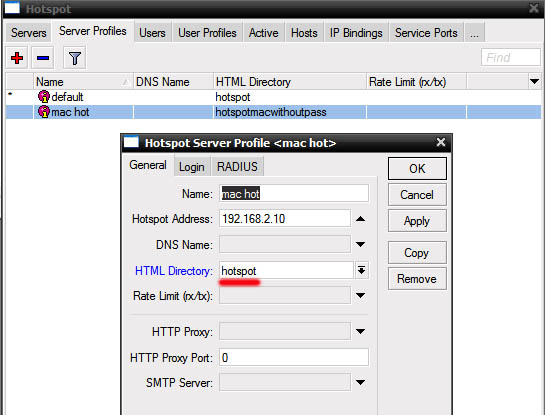 Показать исходный текстСсылки сюдаНаверх Содержание Первичные действия Подготовка для любого вида IPoE/IPNet Авторизация по MAC адресу Авторизация по IP адресу /IP Unnambered Авторизация по Login + Pass Авторизация по MAC + Pass Настройка Walled Garden Блокируем левые IP/подсети Настройка hotspot Первичные действия Более подробно по опциям и настройке Hotspot можно прочесть на официальном сайте микротика: Если вы планируете настраивать Hotspot при помощи NAS Mikrotik, в первую очередь определитесь с типом авторизации для клиентов Hotspot, от этого будут зависеть все дальнейшие настройки Выполните предварительную настройку MIkrotik Mikbill настройка NAS Настройка сегментов в Mikbill Переходить ниже можно только настроив по статьям указаным выше! Теперь, когда у вас настроена авторизация между биллингом и NAS, настроены опции и тип Radius, NTP клиент, DNS и прочее в Mикротике, время приступать к настройке Hotspot. В нашем примере, для клиентов подсеть 192.168.2.0/24, для биллинга подсеть 192.168.9.0/24. Подготовка для любого вида IPoE/IPNet Этот пункт необходимо выполнить 1 раз при первичной настройке. Создание Hotspot Будем использовать при создании визард, на то есть несколько причин, одна из них - корректная настройка визардом фаервола, т.к. логика работы хотспота зависит от него. По поводу DHCP, его можно создать руками, а можно через визард – на ваше усмотрение. Итак, заходим IP-Hotspot-Servers, выбираем Hotspot Setup. Теперь по очереди – выбираем на каком интерфейсе будет работать хотспот, IP адрес этого интерфейса, маскарадить или нет подсеть хотспота, пул адресов для клиентов, сертификат (если планируете испоьзовать SSL). Адрес SMTP сервера, DNS сервера для клиентов, DNS имя хотспота, логин/пароль локального пользователя (нам он не нужен, но визард его просит указать, потом отключите). В итоге мы получили настроеный DHCP, который слушает на клиентском интерфейсе и использует заданный в визарде пул адресов, на скринах это видно: Таже мы получили непосредственно сам хотспот, который слушает на клиентском интерфейсе, использует заданный пул адресов. Дополнительно в настройках надо указать Profile (его вы поменяете под свои нужды, в зависимоти от типа авторизаци), Idle Timeout – отключение клиента после простоя (по необходимости): И настроенный firewall: Настройка типа авторизации Hotspot В первую очередь, в зависимости от типа авторизации, вам необходимо скопировать в Mikrotik файлы профиля, их вы найдете в дистрибутиве биллинга, папка «Mikrotik». Предварительно распакуйте архив. Также не забудьте корректно настроить NAS в биллинге соответственно вашему типу авторизации. Авторизация по MAC адресу Архив с файлами профиля. Откройте IP-Hotspot-Server Profiles закладка General. Hotspot Address – адрес интерфейса, на котором работает хотспот HTML Directory – здесь выбираете профиль, для авторизации по mac «hotspotmacwithoutpass» Откройте IP-Hotspot-Server Profiles закладка Login. Отметьте чекбоксы MAC, HTTP PAP. Cookie – по желанию, для удобства клиента браузер будет хранить cookie. Откройте IP-Hotspot-Server Profiles закладка RADIUS. Отметьте чекбокс Use RADIUS. Авторизация по IP адресу /IP Unnambered Архив с файлами профиля. Пример сервера: Пример профиля: Общий профиль для всех серверов: отсюда берется параметр keepalive В mikbill настроить NAS Авторизация по Login + Pass Этот вид авторизации можно использовать джля WIFI-HotSpot Этот вид авторизации совместим с карточками активации Архив с файлами профиля. Откройте IP-Hotspot-Server Profiles закладка General. Hotspot Address – адрес интерфейса, на которо