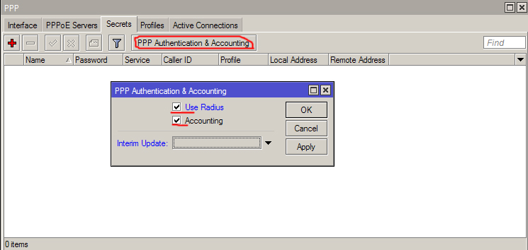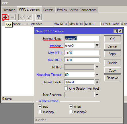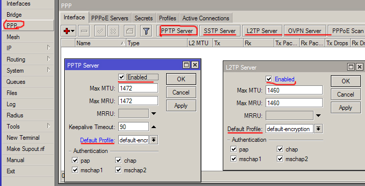Показать исходный текстСсылки сюдаНаверх Настройка PPPoE/PPTP/L2TP[чистовик] Перед настройкой выполните рекомендации по Предварительные настройки[чистовик] Доступ по PPTP/L2TP Открываем окно PPP Нажимаем на «PPTP Server» или «L2TP Server» или другой сервер по вашему желанию. Ниже приведен пример PPTP и L2TP c использованием профиля с шифрованием данных. Чтобы отключить шифрование выберете профиль «default» и отключите типы авторизации mschap1 и mschap2 Добавление PPPoE сервиса 1. Переходим во вкладку PPPoE Servers указываем имя сервиса. Выбираем интерфейс на котором будет доступен сервис. Обычно для этой услуги используют доступ без шифрования, ниже подобный пример. 2. Переходим во вкладку Secrets Нажимаем на «PPP Authentication & Accounting» и делаем как на скриншоте. 3. Осталось настроить профили и уже можно будет использовать Ваш сервер доступа. Переходим к вкладке Profiles Открываем профили «default» и «default-encryption». На вкладке General в профиле обязательно указать ВНИМАНИЕ Local Address - этот IP должен быть уникальным в вашей сети, и не быть связанным ни с каким блоком адресов в вашей сети. Например локальная сеть из блока 10.0.0.0/8 , серые адреса для клиентов 172.16.0.0/12 остался свободный блок 192.168.0.0/16 соотвественно 192.168.0.1 нигде не используется и можно его использовать. Так удобней всего. DNS и WINS сервер по желанию, единственное что не ставьте адрес DNS тем же что и Local Address, лучше указать один из адресов биллинговой машины или же другой DNS вашей сети. Ниже приведен пример настроек профилей, для шифрования и без него. Ниже приведен пример вкладки Limits, со стандартными настройками. Базовая настройка завершена. config/nas_servers/mikrotik/ppoe_pptp_l2tp.txt Последние изменения: 2019/07/29 15:42 — Дмитрий Грошилин