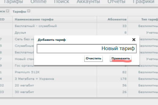 Показать исходный текстСсылки сюдаНаверх Добавление тарифа Для начала входим в «Админку» и открываем «Тарифы» как показано ниже Далее нажимаем на кнопку «Добавить тариф» (обведено красным) появляется окошко куда вводим имя тарифа и жмем применить Все тариф создан. Переходим к "настройке свойств тарифа". old/billing/adding_tariff.txt Последние изменения: 2019/12/26 00:11 — gudwin