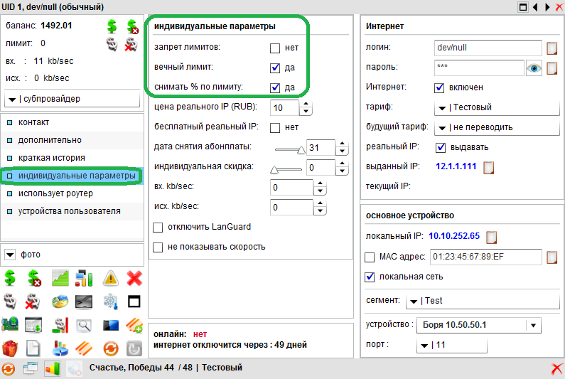 Показать исходный текстСсылки сюдаНаверх Содержание Автообнуление лимитов Условия срабатывания Включение Настройка лимитов/кредитов в тарифе Подробнее Отчетность Работа с кредитами (лимитом) «Кредиты» - как сущность, это возможность дать пользователю уйти в отрицательный баланс (лимит глубины минуса), при этом продолжая получать услугу «Интернет» или другие услуги. Пример: У абонента на счету -1 и ему нужно продлить услугу «Интернет», а устанавливаем значение величины кредита 100 (Значение кредита всегда положительное) Теперь, соответственно, у клиента будет всё работать «по прежнему» пока состояние его счета не станет -100.01. Тогда его уже не пустить в интернет и т.д., активируется «Страницу заглушка» (если таковая была настроена). Кредиты необходимы для предоставления пользователям возможности получать услуги после окончания оплаченного периода. Мы можем задать некий период, к примеру 7 дней, для того чтобы пользователь мог за это время оплатить услуги и, без дискомфорта, продолжал пользоваться интернетом. Базовые настройки кредита находятся в системных опциях: Корректный интервал кредита с 1 по 30 число месяца, т.е. интервал только в датах текущего месяца. Кредит вида с 25.01 по 10.02 работать не будет! На скриншоте указан обычный кредит с 1-7 число. Процентный кредит с 8-15 число. Блокировка кредитов 15 числа. Кредиты закрываются автоматически в указанный день в 23:59 (при стандартной настройке cron'а). Автообнуление лимитов С версии 2.7.22 стало доступно и в версии 2.7.23 отточено автообнуление лимита. При любом действии с балансом абонента «лимит» может быть обнулён автоматически, а услуга «лимит» (кредит) - закрыта. Поскольку это «автоматизация», то те лимиты, которые были открыты вручную - вручную и должны быть закрыты. В данный момент не работает только автообнуление при пополнении из ЛК карточкой. Условия срабатывания Лимит абоненту будет обнулён, если: этот функционал включён в сис. опциях депозит абонента больше нуля лимит абонента больше нуля у абонента есть активная услуга «лимит» у абонента не включён «вечный лимит» Включение В админ. панели: Настройки → системные опции → параметры → вкладка «услуги» → область «временные лимиты»: включить опцию «авто закрытие лимита» Настройка лимитов/кредитов в тарифе Разрешить лимит - Разрешить временный кредит в Личном кабинете Цена активации - Цена активации кредита Плавающая дата - Кредит с плавающей датой, действует только на обычный кредит и дает право получить 1 раз кредит в личном кабинете, при активации параметры из системынх опций игнорируются Разрешить процентный кредит - Разрешает временный процентный кредит в Личном кабинете Цена активации(лимит с %) - Цена активации процентного кредита Процент по лимиту/день - Возврат суммы активации - Возврат суммы активации кредита, если было пополнение счета в течении 24 часов после активации кредита Фиксированный лимит - Фиксированная сумма кредита, вместо автоматической (автоматическая равна величине месячной абонплаты + Цена Реального IP + 1 ) Подробнее При условии, что кредит разрешено «брать» абоненту в свойствах клиентского тарифа. Обычный кредит «берется» пользователем в личном кабинете и равняется сумме абон.платы по тарифному оплаты + стоимость активации (если таковая указана) + реальный (внешний) IP адрес (если у абонента подключена эт