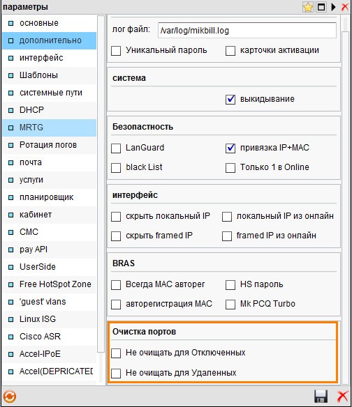 Показать исходный текстСсылки сюдаНаверх Очистка портов С версии 2.11.1 в биллинг добавлена автоматическая очистка портов у отключенных и удаленных абонентов. Сделано это с целью освободить порты не занимаемые абонентами по факту По логике микбилл: Отключенные это к кому вы послали монтажника обрезать кабель Удаленные - монтажник уже обрезал кабель С версии 2.11.4 Добавлена возможность отключить данный функционал: «Не очищать для Отключенных» «Не очищать для Удаленных» МЕНЮ:: Настройка/Системные опции/Параметры/Дополнительно/Очистка портов old/services/clearport.txt Последние изменения: 2019/12/25 00:03 — gudwin