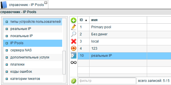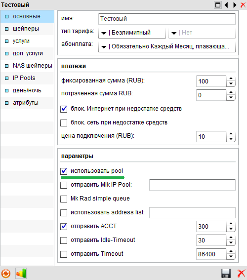Показать исходный текстСсылки сюдаНаверх Работа с услугой "IP пул" Для выдачи динамических реальных адресов используется справочник «IP pool», в который вы должны внести диапазоны для клиентов. Важный момент. Диапазоны адресов в справочнике «Реальных IP» не должны пересекаться с диапазонами в справочнике «IP pool»! Желательно вводить подсети с 24 по 32 маски. Таких блоков в пул можно вводить сколько угодно 1 и тот же пул можно использовать во всех тарифах Пул для без денег не стоит использовать в тарифах Далее, на странице редактирования тарифа: Тарифы → Редактировать тариф «ваш_тариф_где_нужен_реальный_адрес» → Основные и выберем чекбокс «Использовать Pool»: Далее на закладке «IP Pools» необходимо выбрать пул, который вы только что создали и заполнили IP адресами: После совершенных действий, биллинг автоматически перезапустит Radius. Если изменения не применились, то необходимо вручную это сделать. old/services/dynamic_real_ip.txt Последние изменения: 2019/12/20 01:09 — gudwin