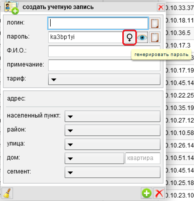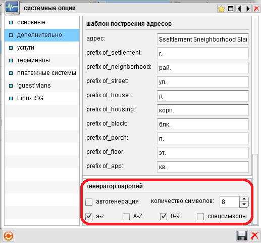 Показать исходный текстСсылки сюдаНаверх Генератор паролей Расположение: НАСТРОЙКИ → СИСТЕМНЫЕ ОПЦИИ → ДОПОЛНИТЕЛЬНО → АВТОЗАПОЛНЕНИЕ ПАРОЛЬ Описание: При создании учётной записи абонента будет доступна кнопка генерации пароля. Также можно в Системных Опциях настроить таким образом, чтобы пароль генерировался при открытии окна создания абонента автоматически (параметр автогенерация). По-умолчанию должны быть выбраны 'a-z' и '0-9', а так же длина в 8 символов. Если это не так, то это всё равно будет так: если поставить длину 0, то при генерации будет выбрано 8 символов, а если не выбрать ни один из типов символов, то будет генерирование пароля на основе «a-z» & «0-9». Создание абонента Как это выглядит при создании абонента: old/services/generate_password.txt Последние изменения: 2019/12/24 23:59 — gudwin