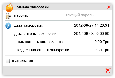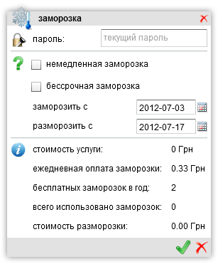 Показать исходный текстСсылки сюдаНаверх Активация услуги "Заморозка" Позволяет пользователю «заморозить» свою учетную запись на определенный период. Опция «Немедленная заморозка» позволяет заморозить учетную запись моментально. Если же указать дату начала заморозки, то в силу она вступит с полуночи, указанной даты. Аналогичная ситуация с «Бессрочной заморозкой». Если указать дату разморозки, то учетная запись автоматически «разморозится» в полночь указанного числа. При «замороженной» учетной записи из всех пунктов меню будет доступен только один - «Разморозить». Так же это окно автоматически появляется при входе в кабинет пользователя с «замороженной» учетной записью, если не была указанна дата автоматической отмены заморозки. Обе операции требуют подтверждения паролем. Пункт «стоимость отмены заморозки:« - это средства снимаемые в любом случае, как при ручной разморозке, так и при автоматической. В случае некорректной работы отмены заморозки необходимо убедиться в наличии скрипта /sys/scripts/mikbill_unfreeze, в правильности указания путей и его работоспособности. Настройка Доступ к услуге регулируется пунктом (31) «Разрешить разморозку» во вкладке «Услуги» в свойствах тарифа. Опция (32) «Возвращать абонплату» определяет будет ли возвращена абонплата на счет пользователя при заморозке учетной записи, при разморозке абонплата снимается. Опция (33) «Бессрочная заморозка» дает возможность заморозить учетную запись на неопределенный период. (34) «Цена заморозки», (35) «Цена разморозки», (36) «Цена суток в заморозке» понятны без комментариев. (37) «Мин суток для заморозки» определяет минимальный период заморозки учетной записи. (38) «Бесплатные заморозки» - это количество бесплатных заморозок в год. Для каждого тарифа настройки индивидуальны. old/services/service_freezing.txt Последние изменения: 2019/12/24 23:08 — gudwin