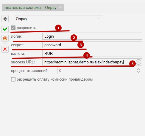Показать исходный текстСсылки сюдаНаверх Onpay.ru [чистовик] Аннотация Прием платежей происходит по принципу выставления счета абоненту через личный кабинет MikBill. В качестве платежной системы для абонента выступает интерфейс onpay.ru, т.е. выполняется платеж через форму Onpay. Настройка Перед началом настройки, заключите контракт с Onpay и получите все данные от менеджера. Далее настройка выполняется самостоятельно. Выбираем пункт меню - Магазины Скролим вниз до пунктов меню API Указываем: Пароль для API Ваш пароль Метод отправки запросовВыбрать POST URL APIhttps://admin.ispnet.demo.ru/ajax/index/onpay Тип APIвыбрать https1 Защита MD5выбрать галочку Важно 1. https://admin.ispnet.demo.ru – должен быть внешним доменом Если у вас самоподписанный сертификат то вероятность 99% onpay не будет с ним работать, поэтому сделайте еще 1 виртуалхост для админки без сертификата и используйте только http ссылку Все остальные настройки делайте в интерфейсе Onpay как вам необходимо. Настройка в MikBiLL Перейти «Настройки»→ «системные опции» →«платежные системы»→«OnPay» Переходим в MikBill и заполняем соответствующие поля: Указываем ваш логин, секрет, ссылку на личный кабинет и % отчислений для отчетности. Логином является идентификатор(название) магазина. Тонкая настройка Если вдруг при платеже из Личного Кабинета у Вас откроется пустая страница. Исправить это можно очень легко. открываем файл onpay.php в каталоге личного кабинета на сервере. /var/www/mikbill/stat/onpay.php - Linux /usr/local/www/mikbill/stat/onpay.php - BSD Находим строку 103 в ней будет следующее: $url = "http://secure.onpay.ru/pay/".$login."?".$utl_text; так ваот вам нужно указать верную ссылку т е Если ваш «личный кабинет» открывается по HTTPS тогда укажите $url = "https://secure.onpay.ru/pay/".$login."?".$utl_text; Если ваш «личный кабинет» открывается по HTTP тогда укажите $url = "http://secure.onpay.ru/pay/".$login."?".$utl_text; Если жалуются на то что форма Onpay не влазит в экран и нет скролла тогда найдите строку 105 в ней будет следующее: $output = '<iframe src="'.$url.'" width="600" height="900" frameborder="0" scrolling=no></iframe> поменяйте на $output = '<iframe src="'.$url.'" width="600" height="900" frameborder="0" scrolling=yes></iframe> paysystems/paysystem/onpay.txt Последние изменения: 2019/08/29 11:07 — Дмитрий Грошилин