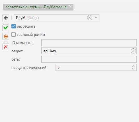 Показать исходный текстСсылки сюдаНаверх PayMaster.ua [чистовик] Внимание! Paymaster - украинская платежная система (не путать с paymaster.ru) Список поддерживаемых систем приема платежей: https://paymaster.ua/companies/payment-systems Пример на подключение провайдера Регистрация: https://merchant.paymaster.ua/index/register/ Result URLhttps://admin.ispnet.demo/ajax/index/paymaster «Result URL» Обязательно должен быть внешним доменом! Не забываем заменить «admin.ispnet.demo» и «stat.ispnet.demo» на свой Внешний домен, который доступен из интернет. http или https несущественно, главное чтобы по этой ссылке (https://admin.ispnet.demo) вы могли попадать в админку из интернета, а по ссылке (http://stat.ispnet.demo) - в личный кабинет из интернета. Настройка MikBill Для настройки в админ. Перейти «Настройки»→ «системные опции» →«платежные системы»→«PayMaster.ua» Не забываем отметить «Разрешить». Параметр Пояснение Обязательные: ID мерчанта Логин магазина секрет секрет магазина сеть подсеть, из которой будут приходить запросы (уточните у менеджера в момент подключения) Всё, настройка закончена. Настройки для субпровайдера Подробней тут paysystems/paysystem/paymaster.txt Последние изменения: 2019/08/29 11:15 — Дмитрий Грошилин