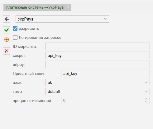 Показать исходный текстСсылки сюдаНаверх Содержание Пример на подключение провайдера Настройка UkrPays Настройка MikBill UkrPays [чистовик] Сайт: https://ukrpays.com/v2/ Пример на подключение провайдера Result URLhttps://admin.ispnet.demo/ajax/index/ukrpays «Result URL» Обязательно должен быть внешним доменом! Не забываем заменить «admin.ispnet.demo» и «stat.ispnet.demo» на свой Внешний домен, который доступен из интернет. http или https несущественно, главное чтобы по этой ссылке (https://admin.ispnet.demo) вы могли попадать в админку из интернета, а по ссылке (http://stat.ispnet.demo) - в личный кабинет из интернета. Настройка UkrPays Настройка MikBill Перейти «Настройки»→ «системные опции» →«платежные системы»→«УкрPays» id мерчанта - указываем id мерчанта секрет - вставляем Ключ для md5 полученнный выше urlpay -https://ukrpays.com/frontend/frontend.php (уточнить у менеджера) приватный ключ - пусто Не забываем отметить «Разрешить». Все настройка закончена. paysystems/paysystem/ukrpays.txt Последние изменения: 2019/08/29 11:26 — Дмитрий Грошилин