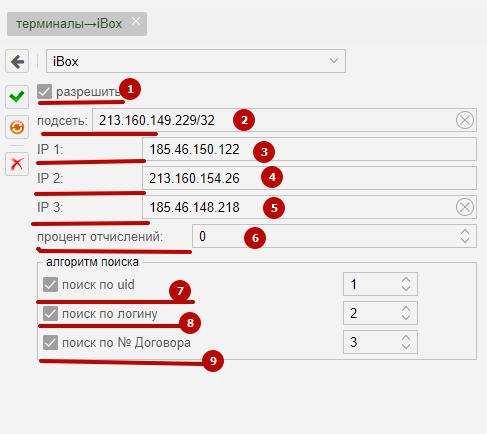 Показать исходный текстСсылки сюдаНаверх Содержание Услуги Настройка MikBill Примеры ответов iBox (OSMP) [чистовик] Украина iBoxhttp://ibox.com.ua/ Свяжитесь с менеджером компании от которой вам нужны услуги и заключите контракт. Для взаимодействия Вам понадобится передать менеджеру ссылку на обработчик транзакций. Server URLвида https://admin.ispnet.demo/ajax/index/ibox Пояснение «Server URL» Обязательно должен быть внешним доменом! Не забываем заменить «admin.ispnet.demo» на свой Внешний домен, который доступен из интернет. http или https несущественно, главное чтобы по этой ссылке(https://admin.ispnet.demo) вы могли попадать в админку из интернета. Услуги Услуга, для пополнения счета, может быть 3-х видов: пополнение по номеру UID абонента по логину абонента по № договора абонента В данной платёжной системе реализована система алгоритмического поиска абонентов, с которой настоятельно рекомендуем ознакомиться по ссылке ниже: алгоритм_поиска_абонентов Поиск и оплата происходит для основных групп пользователей: обычный (базовый) и замороженный. В зависимости от того в каком виде будет получен запрос, сервер MikBill автоматически его обработает, настроек не требует. Настройка MikBill Перейти «Настройки» → «системные опции» →«терминалы»→«Ibox» Не забываем отметить «Разрешить». Подсеть обязательно должна заканчиваться размером маски. Для одного IP - /32 Указываем подсеть откуда будут приходить запросы. Рекомендуется уточнить у менеджера из какой подсети и/или IP адресов будут приходить запросы процессинга. На момент написания статьи были IP (c 24.11.2014): 213.160.149.229/32 185.46.150.122 213.160.154.26 185.46.148.218 Укажите % отчислений - необходимо для отчетности. Все настройка закончена. Примеры ответов С версии 2.5.1 значение тега <fields> в ответе на команду check будет в таком виде: Доп. параметрЗначение атрибута nameЗначение field1fioФИО field2homeНомер дома field3apartmentКвартира paysystems/terminals/ibox.txt Последние изменения: 2019/08/29 11:50 — Дмитрий Грошилин