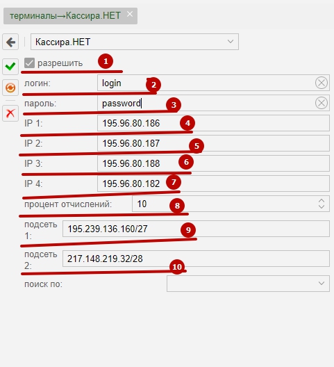 Показать исходный текстСсылки сюдаНаверх Содержание Пример заявки на подключение провайдера Услуги Настройка MikBill Кассира.нет[чистовик] Терминалы "Кассира.нет" Пример заявки на подключение провайдера Сообщите менеджеру Server URL вида https://admin.ispnet.demo/ajax/index/kassiranet «Server URL» Обязательно должен быть внешним доменом! Не забываем заменить «admin.ispnet.demo» на свой Внешний домен, который доступен из интернет. http или https несущественно, главное чтобы по этой ссылке(https://admin.ispnet.demo) вы могли попадать в админку из интернета. Услуги Выбор способа пополнения по UID или по Логину происходит автоматически на стороне сервера. Поиск и оплата происходит для всех типов пользователей (обычный, замороженный, отключенный, удаленный). В зависимости от того в каком виде будет получен запрос, сервер MikBill автоматически его обработает, настроек не требует. Настройка MikBill Перейти «Настройки»→ «системные опции» →«терминалы»→«Кассира.НЕТ» Не забываем отметить «Разрешить». Параметр Пояснение Обязательные: логин Логин пароль Пароль IP IP адрес, с которого разрешен доступ подсеть Подсеть, из которой разрешен доступ Не обязательные: процент отчислений Необходимо для отчетности Указываем IP-адреса и Подсети. В примере указаны IP-адреса и подсети, которые были актуальны на момент написания поддержки данной системы: IP-адреса: 195.96.80.186, 195.96.80.187, 195.96.80.188 и 195.96.80.182; Подсети: 195.239.136.160/27 и 217.148.219.32/28. Не оставляйте поля подсети и IP пустыми - укажите одинаковые значения если, вдруг, дадут всего 1 IP. Всё, настройка закончена. paysystems/terminals/kassira_net.txt Последние изменения: 2019/08/16 19:13 — Дмитрий Грошилин