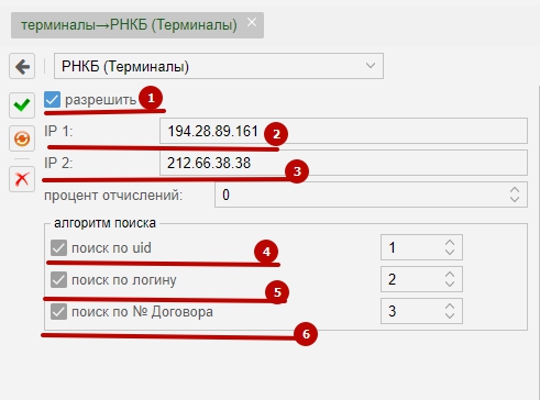 Показать исходный текстСсылки сюдаНаверх Содержание Пример заявки на подключение провайдера Услуги Настройка MikBill РНКБ [чистовик] http://www.rncb.ru/ Пример заявки на подключение провайдера Сообщите менеджеру Server URL вида https://admin.ispnet.demo/ajax/index/rnkb «Server URL» Обязательно должен быть внешним доменом! Не забываем заменить «admin.ispnet.demo» на свой Внешний домен, который доступен из интернет. Услуги Услуга, для пополнения счета, может быть 3-х видов: пополнение по номеру UID абонента по логину абонента по № договора абонента В данной платёжной системе реализована система алгоритмического поиска абонентов, с которой рекомендуем ознакомиться по ссылке ниже: алгоритм_поиска_абонентов Поиск и оплата происходит для основных групп пользователей: обычный (базовый) и замороженный. В зависимости от того в каком виде будет получен запрос, сервер MikBill автоматически его обработает, настроек не требует. Настройка MikBill Перейти «Настройки» → «системные опции» → «терминалы» → «РКНБ (Терминал)» Не забываем отметить «Разрешить». Всё, настройка завершена. paysystems/terminals/rnkb.txt Последние изменения: 2019/08/29 11:44 — Дмитрий Грошилин