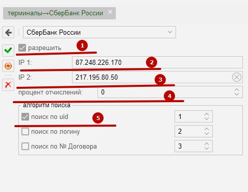 Показать исходный текстСсылки сюдаНаверх СберБанк России [чистовик] Платежная система СберБанк (НЕ ООО «Бил. технологии») Сайт: http://www.sberbank.ru/ Пример на подключение провайдера Result URLhttps://admin.ispnet.demo/ajax/index/sberbankru «Result URL» Обязательно должен быть внешним доменом! Не забываем заменить «admin.ispnet.demo» и «stat.ispnet.demo» на свой Внешний домен, который доступен из интернет. http или https несущественно, главное чтобы по этой ссылке (https://admin.ispnet.demo) вы могли попадать в админку из интернета, а по ссылке (http://stat.ispnet.demo) - в личный кабинет из интернета. Настройка MikBill Перейти «Настройки» → «системные опции» → «терминалы» → «СберБанк России» Не забываем отметить «Разрешить». Параметр Пояснение Обязательные: IP 1 IP адрес, с которого разрешен доступ IP 2 IP адрес, с которого разрешен доступ Не обязательные: процент отчислений Необходимо для отчетности Указываем IP-адрес. Актуальный на момент написания поддержки данной системы: IP 1: 87.248.226.170; IP 2: 217.195.80.50 Все настройка закончена. paysystems/terminals/sberbankru.txt Последние изменения: 2019/08/16 19:16 — Дмитрий Грошилин